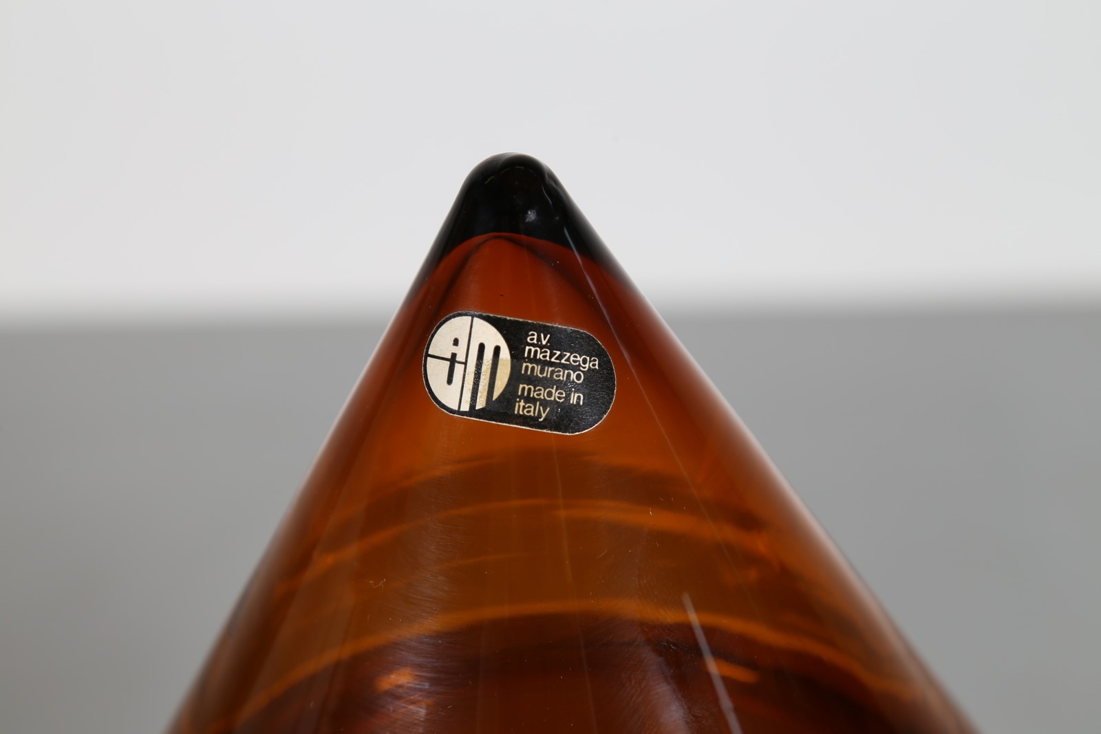 NASON CARLO (n. 1936) Contenitore piramidale in vetro ambra, per A V Mazzega, anni 70. -. Cm 29,00 x 26,00 x 29,00. Etichetta presente
