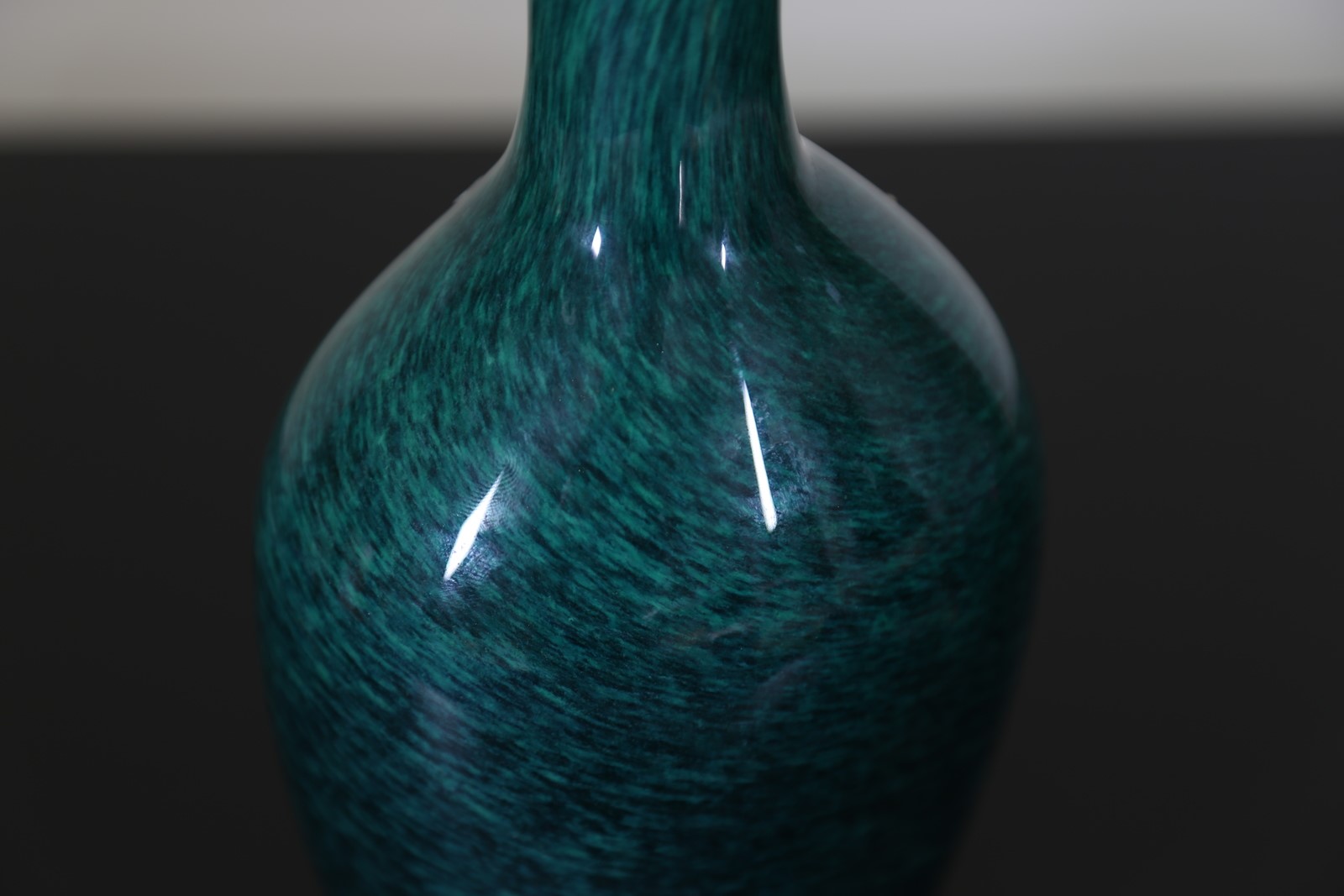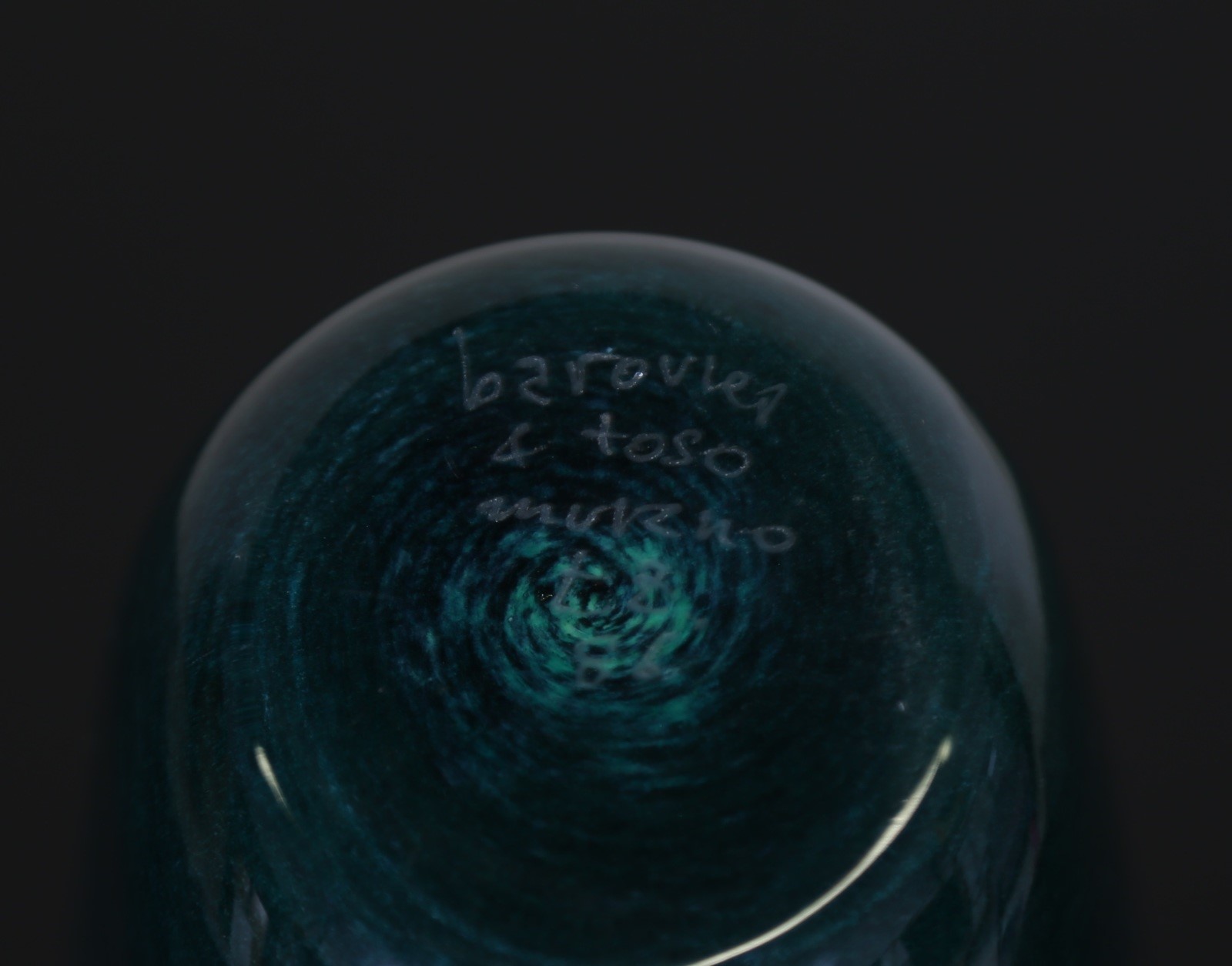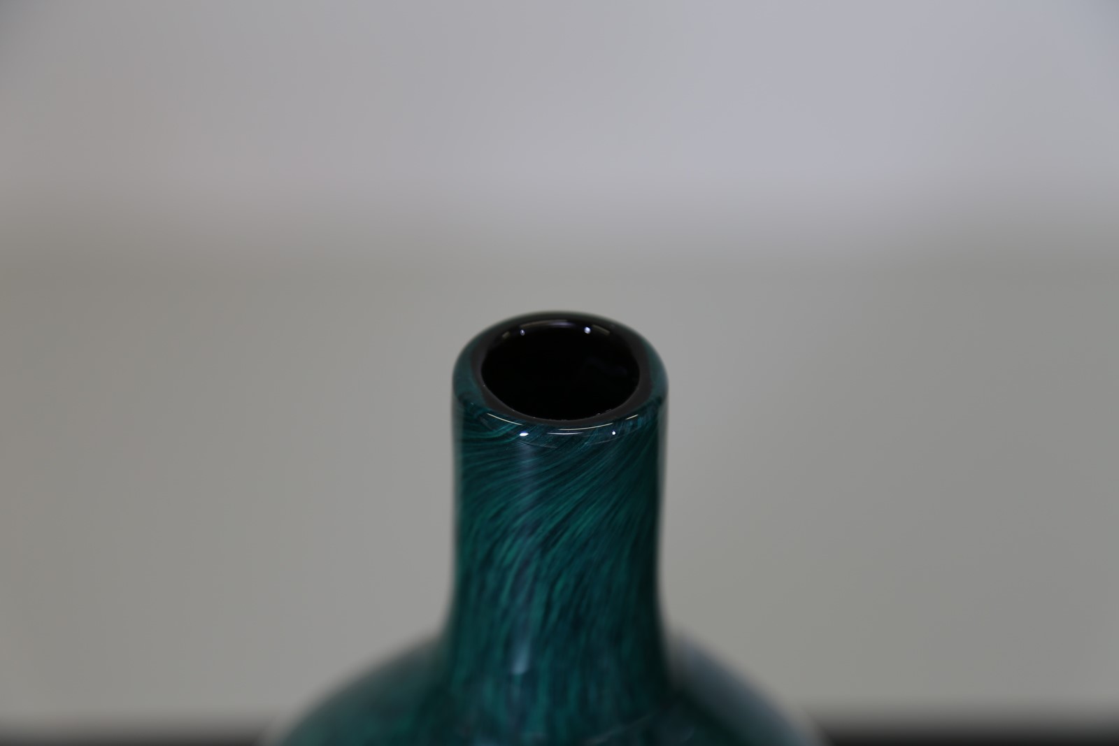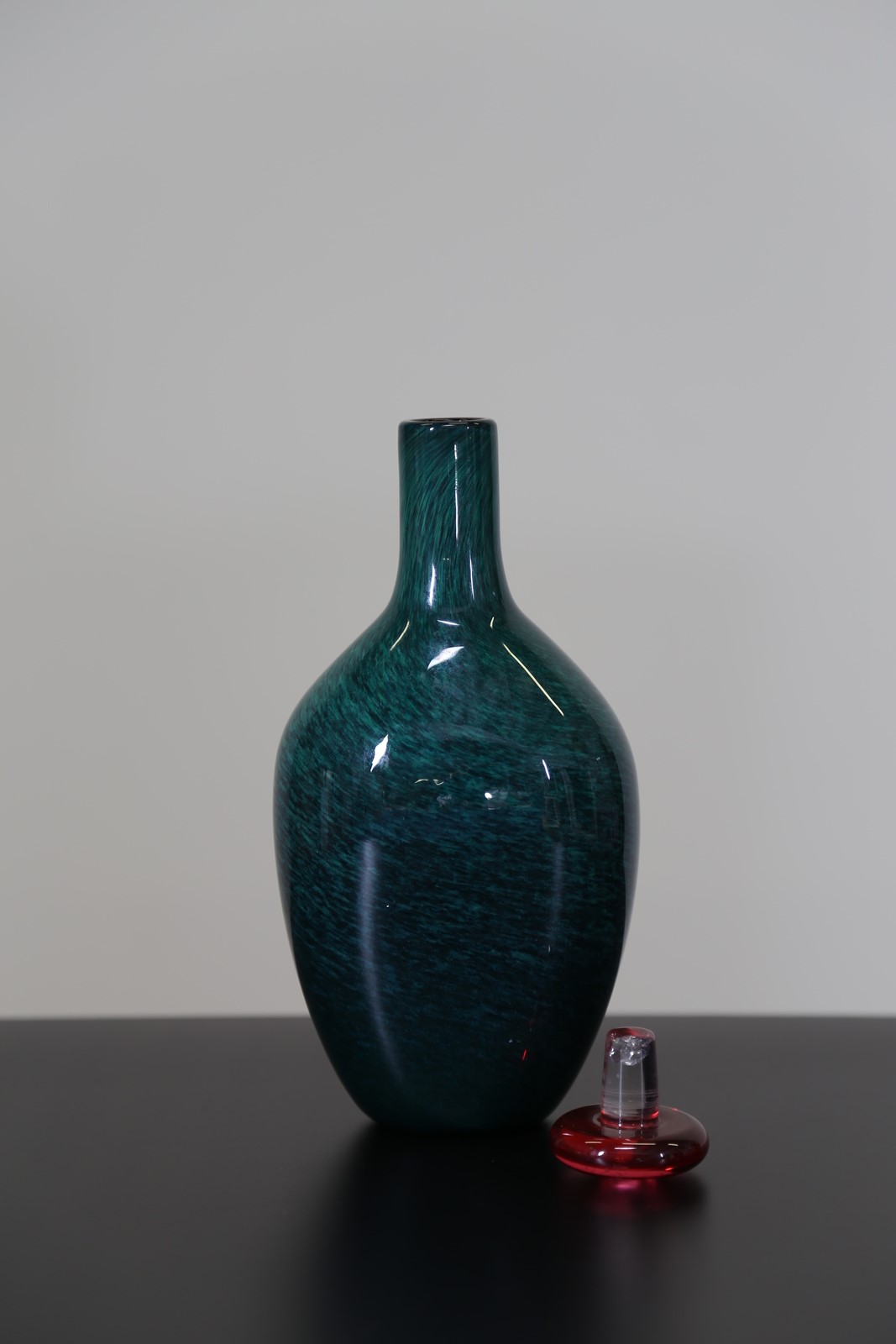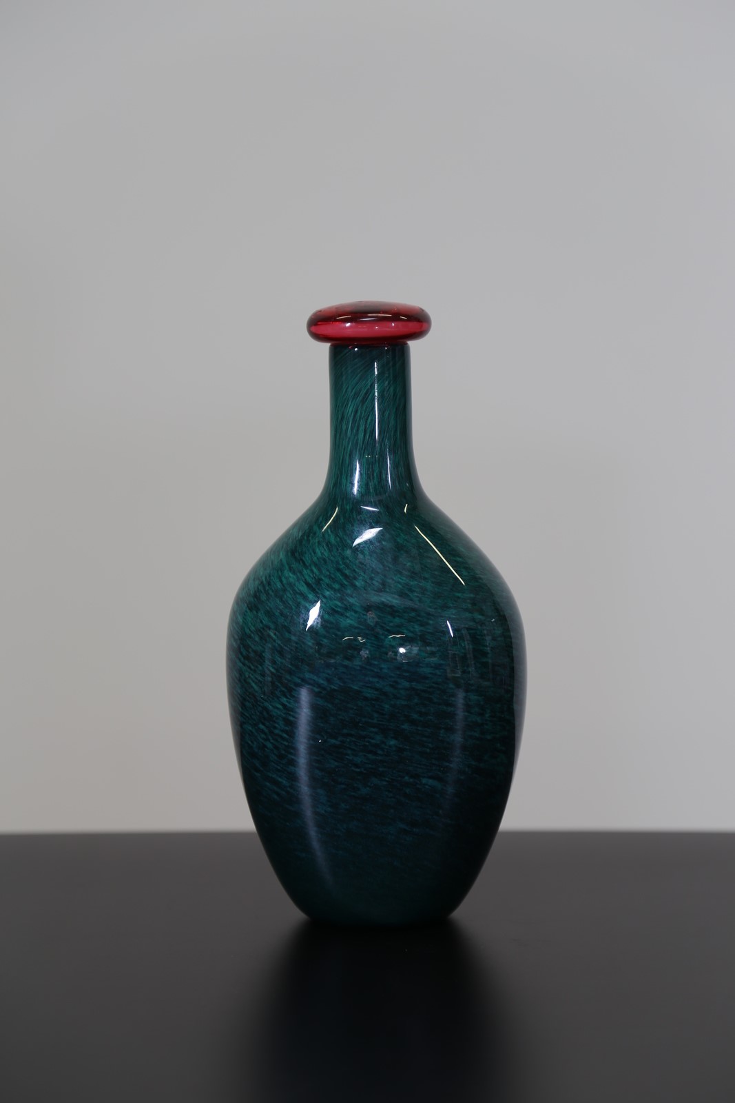ZUCCHERI TONI (1937 - 2008) Bottiglia verde con tappo rosso per la serie i marmi, per Barovier & Toso anni 80. . -. Cm 12,00 x 24,50 x 9,00. Firma presente. Pubblicazioni; Casa Vougue num. 147 dicembre1983 pag. 208.
