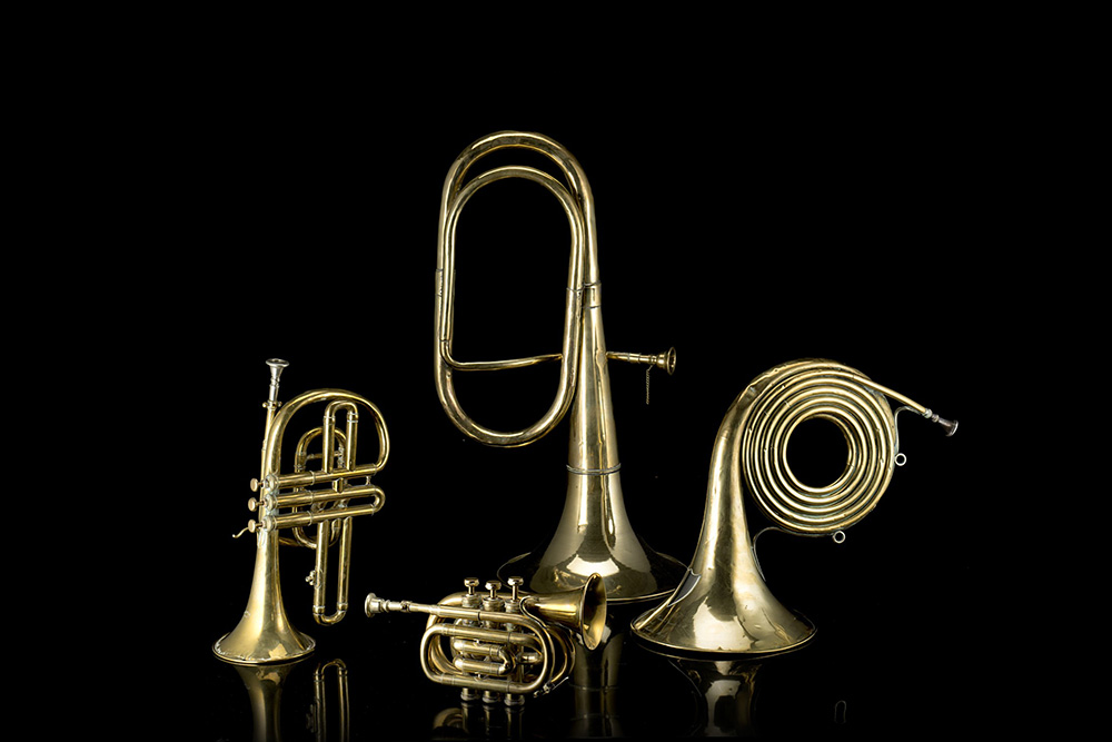 Lotto di quattro strumenti a fiato composto da un trombone, un corno e due trombe a pistoni , tutti in ottone, il corno porta stampata la scritta «Jules Martin I. Cournier Gendre & S.r / Breveté / 4. Boulevard S.t Martin Paris», una delle trombe ha la stampa «Gautrot Aine / Paris»