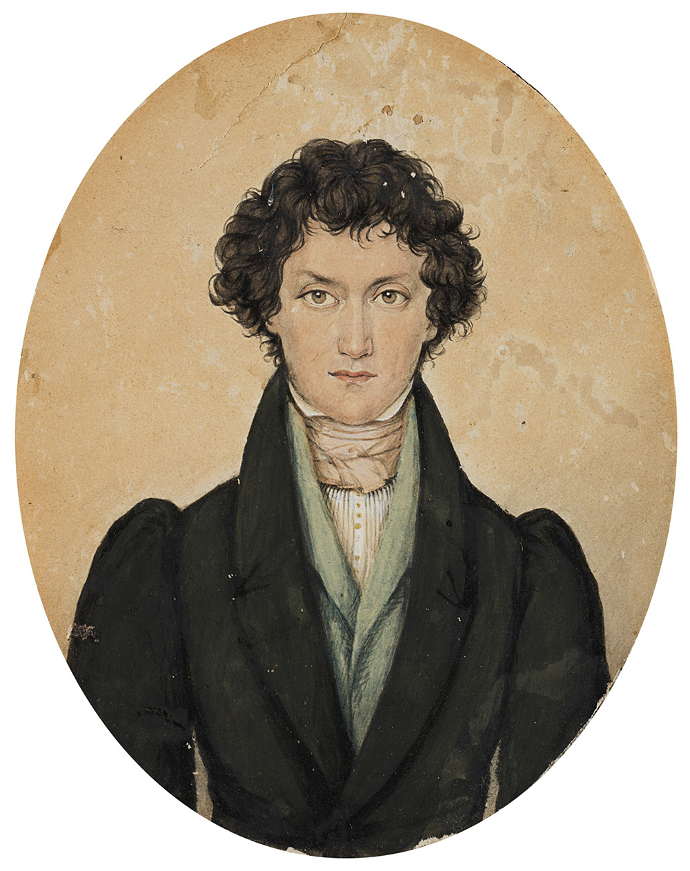 Master of the 19th century "Portrait of a Gentleman" watercolour on paper applied to cardboard. Inscribed and dated 1830 to reverse. Framed (defects)