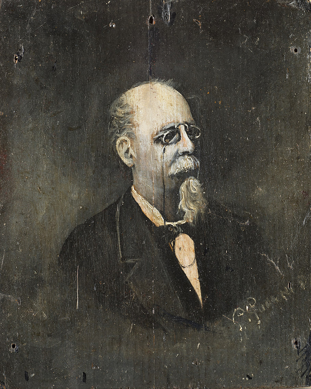 Indeciphered signature, late 19th century "Portrait of a Gentleman with Spectacles" oil on panel (cm 14x12) Framed (defects)