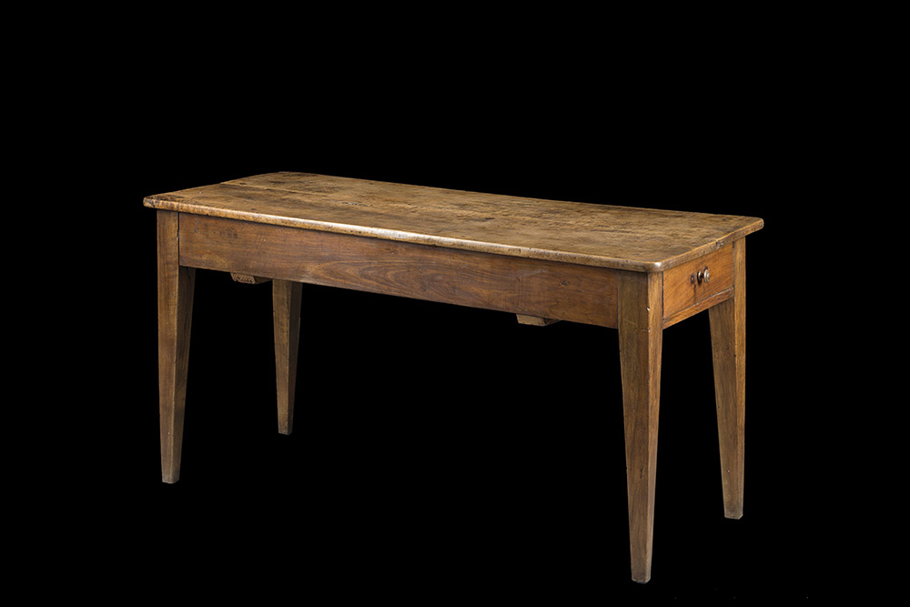 Tavolo rettangolare in noce ad un cassetto laterale. Gambe rastremate (cm 140x75x68) (difetti)