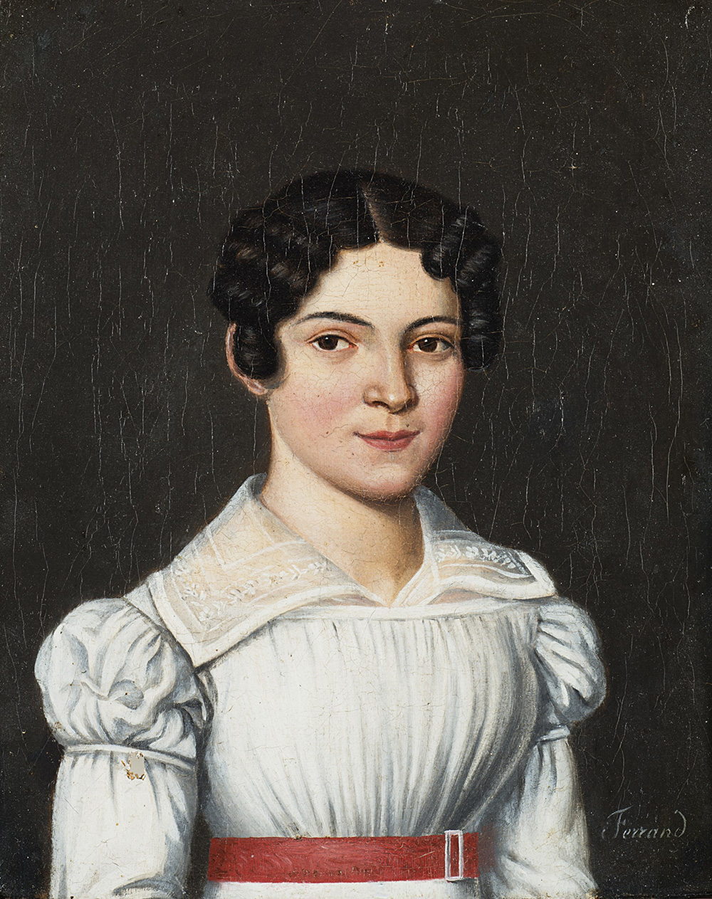 (attributed) "Young Woman in a White Dress with a Red Belt" oil on canvas (cm 21.5x17) Framed (defects)