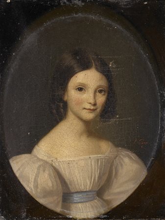 F. Papiol "Ritratto di fanciulla con abito bianco" olio su tela (cm 25x20) In cornice coeva in legno e pastiglia dorata (difetti)