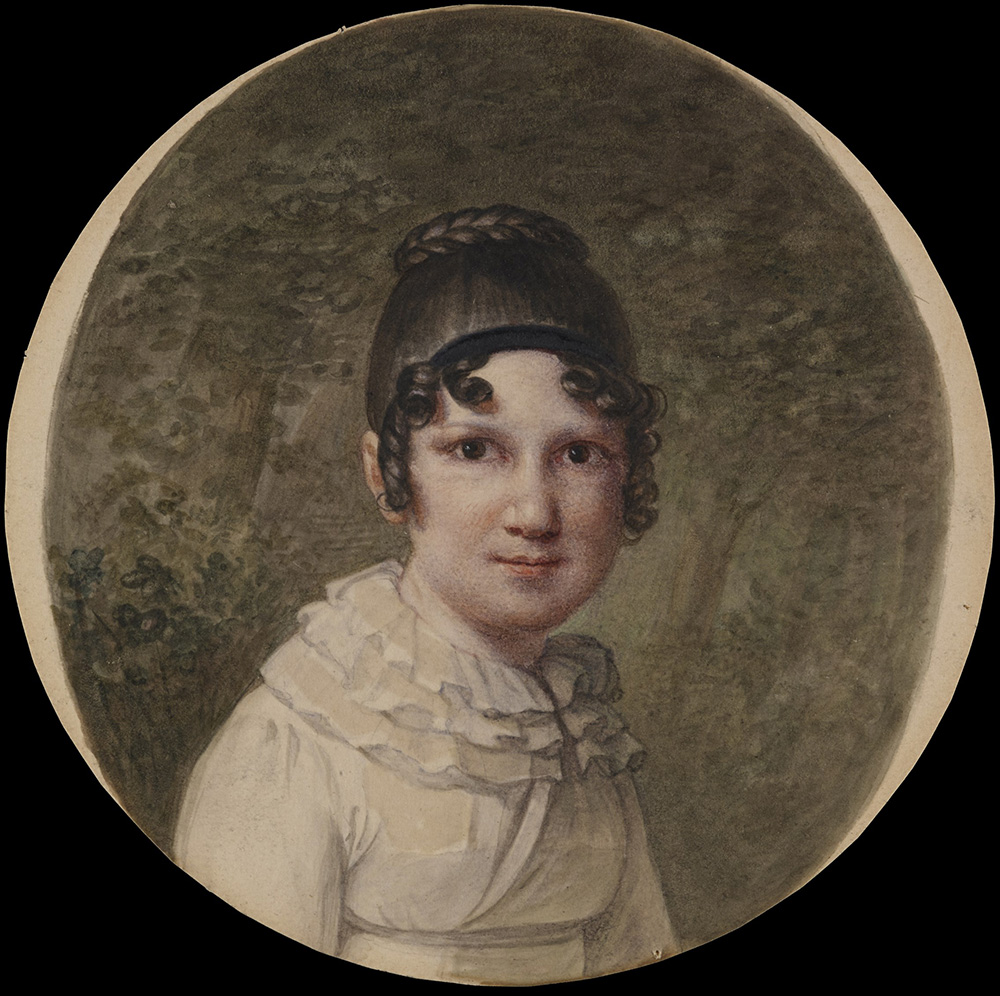 Master pf the early 19th century "Portrait of a young girl in a wood" rounded watercolour miniature on paper (d. cm 12) Attributive label to Domenico Quaglio (1786-1837) on the reverse