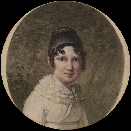 Maestro dell'inizio del sec. XIX "Ritratto di fanciulla in un bosco" miniatura tonda ad acquerello su carta (d. cm 12) Etichetta attributiva al retro a Domenico Quaglio (1786 - 1837)