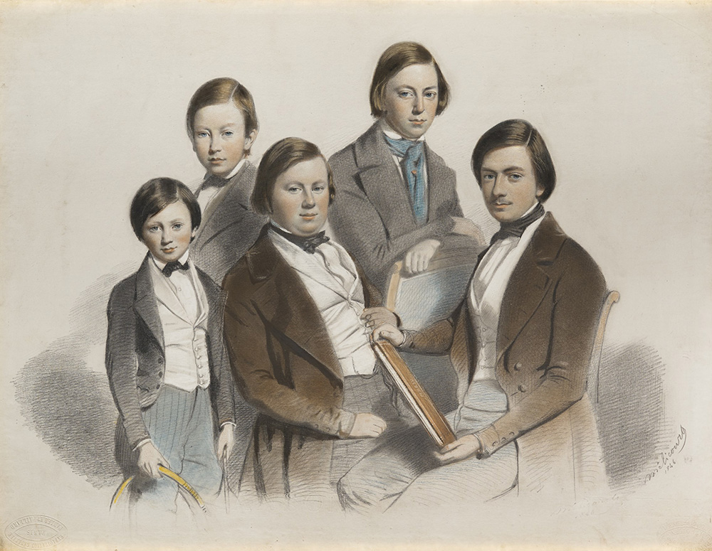School of the 19th century "Family portrait" pencil and crayon on paper (cm 28x36) Signed Melicourt and dated 1846 lower right. Framed (defects)
