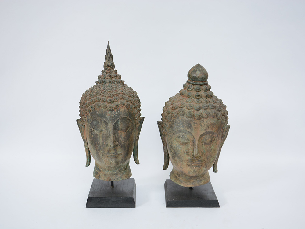 Lotto di due teste di Buddha in bronzo, su basi in legno (difetti) (h. max 45 cm.)