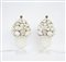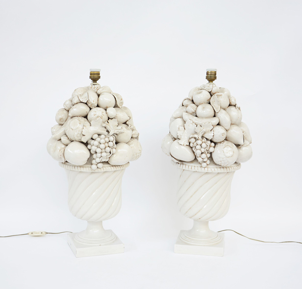 Manifattura del secolo XX. Una coppia di vasi con frutta in ceramica bianca (h cm 60) montati a lampada (difetti)