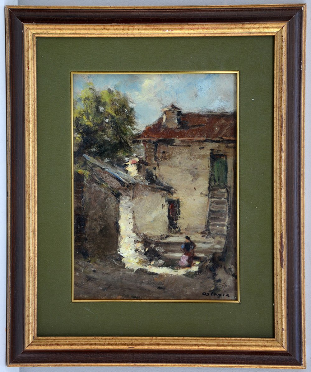 Italo Oslavia (XX Secolo 0) "Scorcio con case" olio su cartone (cm 35x25) firmato in basso a destra. In cornice