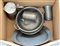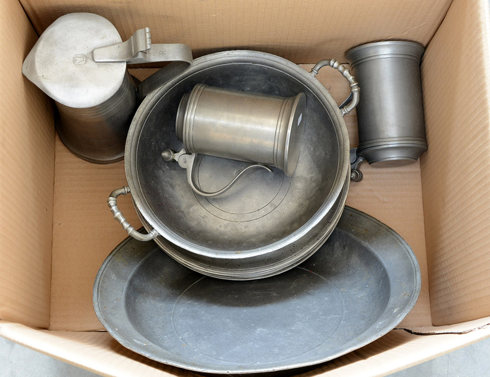 Cartone contenente oggetti in peltro per la tavola: otto piatti, un catino, due boccali e un versatoio (difetti)
