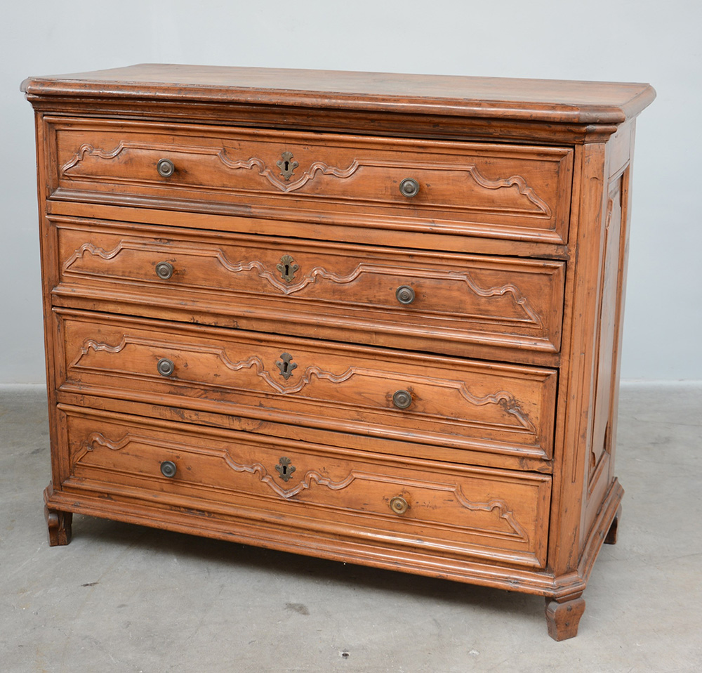 Antico cassettone in noce con fianchi pannellati a quattro cassetti sul...