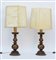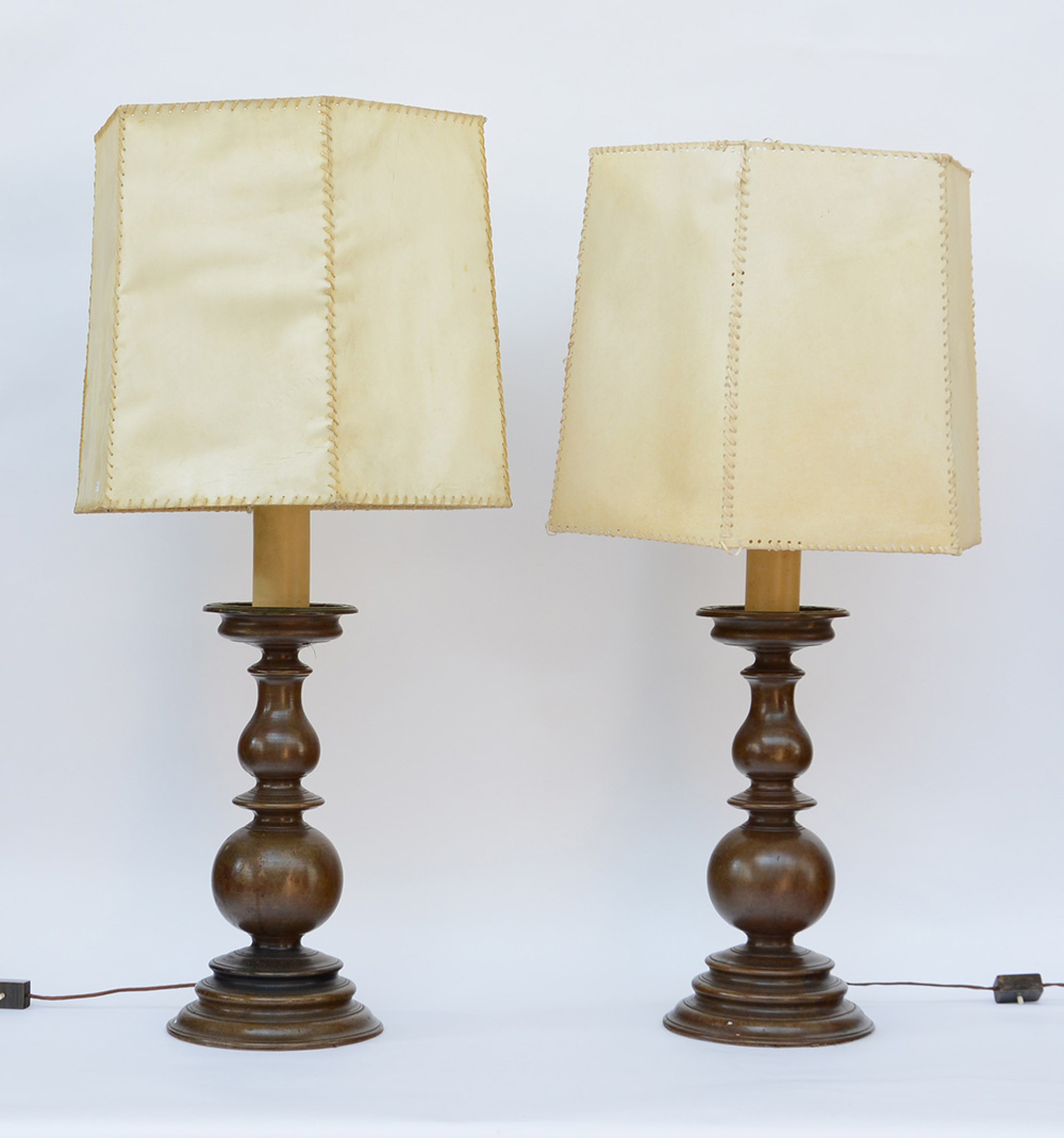 Coppia di grandi candelieri ad una fiamma in bronzo tornito (h cm 44) montati a luce elettrica, paralumi in finta pergamena