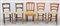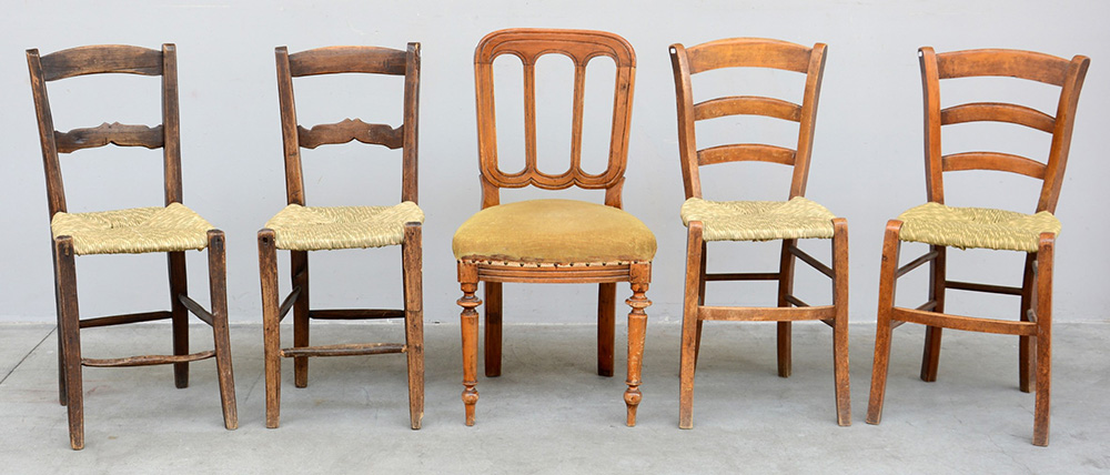 Lotto di quattro sedie rustiche con seduta in paglia e una con gambe anteriori tornite e seduta imbottita (difetti) -EN Lotto di quattro sedie rustiche con seduta in paglia e una con gambe anteriori tornite e seduta imbottita (difetti)