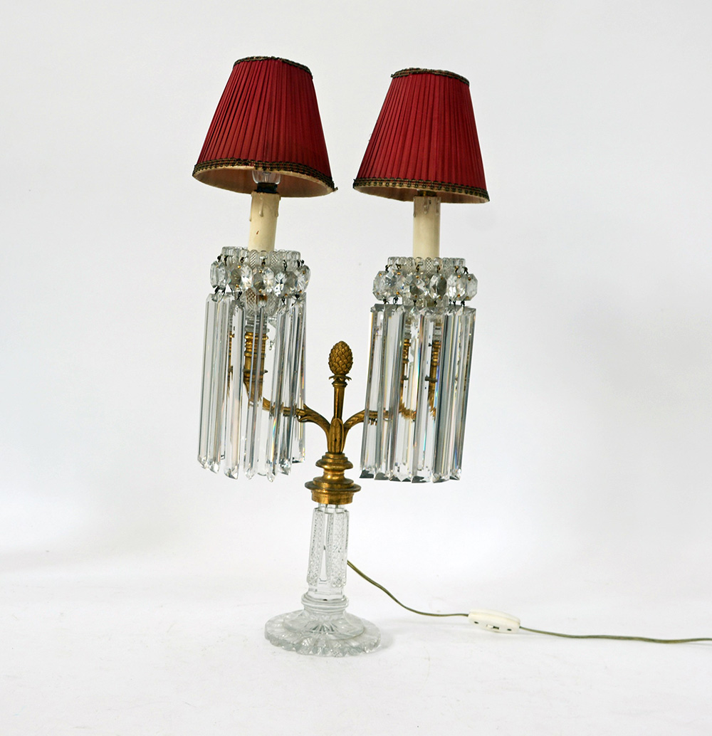 Lampada da tavolo a due con struttura in bronzo dorato e cristallo (h cm 37)(montata a luce elettrica)