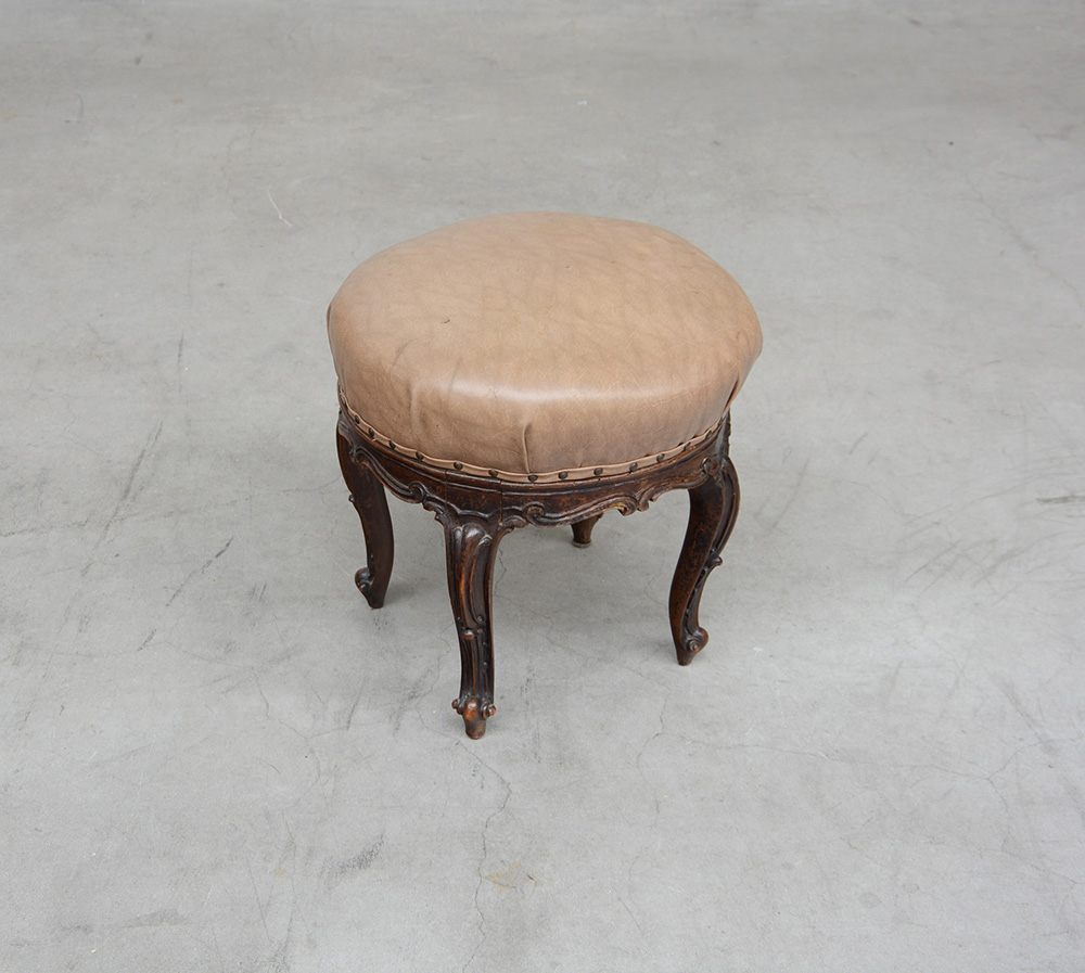 Tabouret in legno intagliato con gambe mosse e seduta rivestita in skai, fine sec. XIX (difetti)