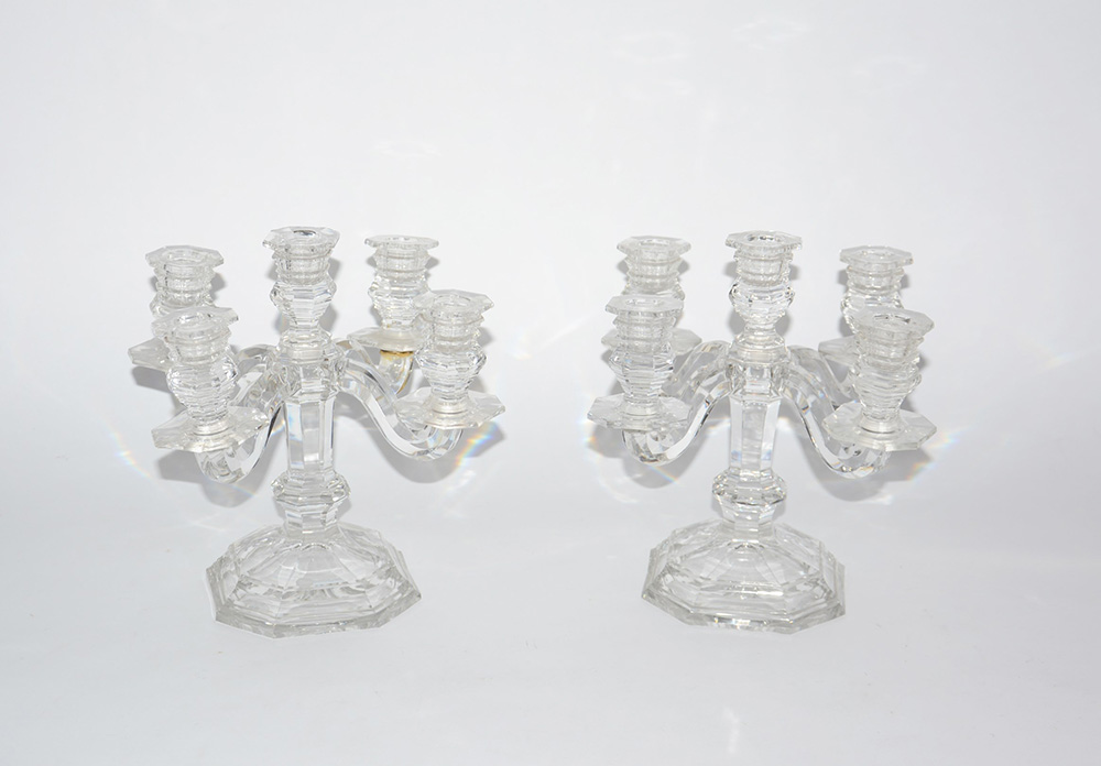 Coppia di candelieri in cristallo a cinque fiamme (h cm 25) (difetti)