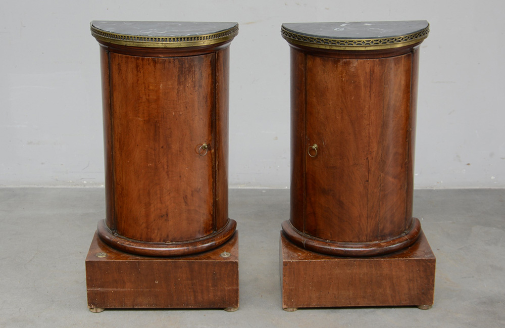 Coppia di comodini a mezzacolonna tornita ad uno sportello pianetti in marmo...