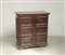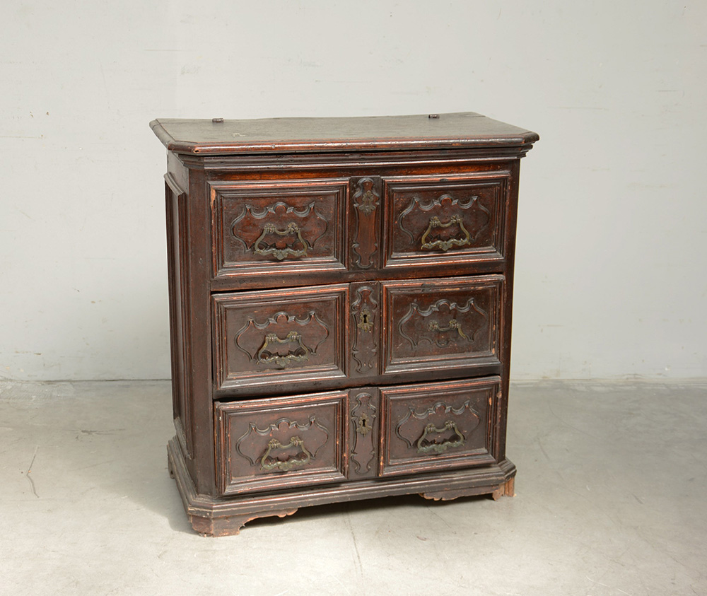 Madia con struttura a cassettone in legno tinto con due cassetti ed uno finto, decorati a bugnature sagomate, piano apribile e piedi a mensola (cm 88x95x45) (difetti e mancanze)