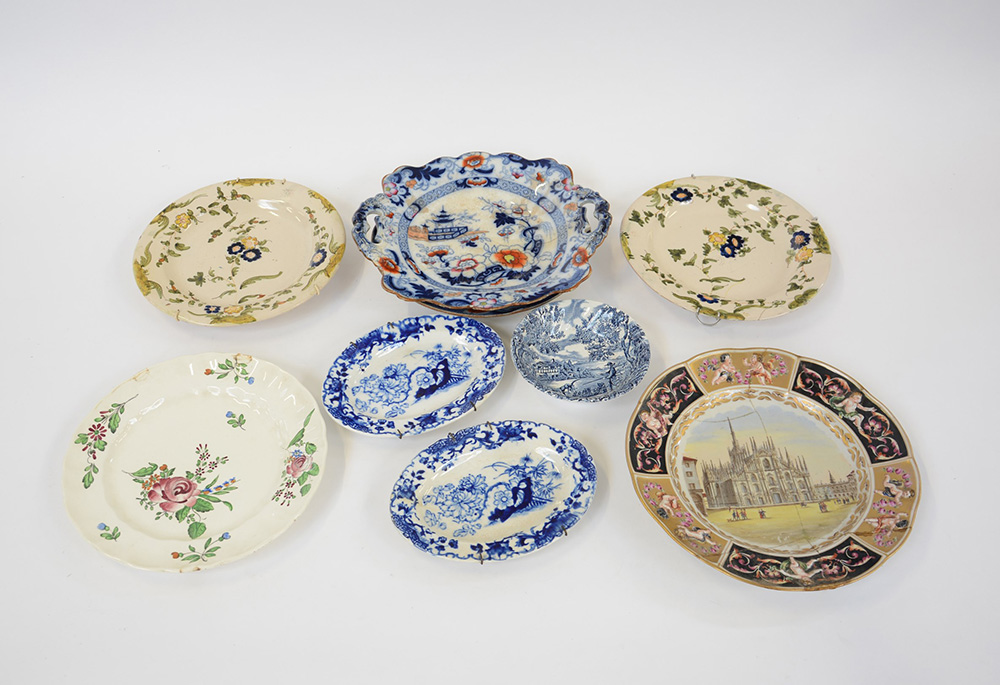 Manifatture diverse. Lotto composto da cinque piatti, un vassoio tondo biansato, una ciotola e due vassoietti ovali in ceramica con misure e decori diversi (difetti e vecchi restauri)