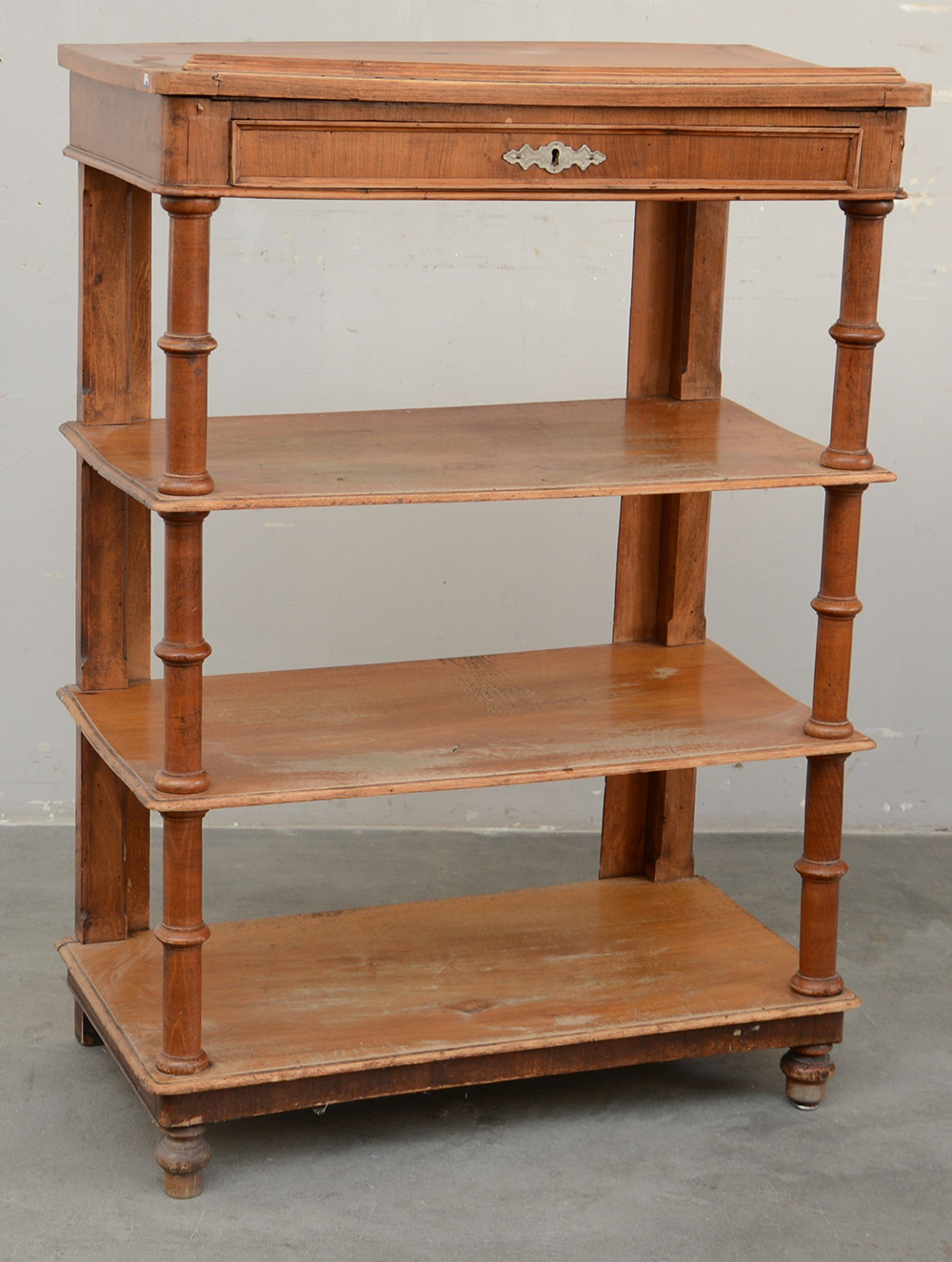 Etagere a quattro ripiani, un cassetto nella fascia, montanti anteriori torniti (cm 80x114x44) (difetti)