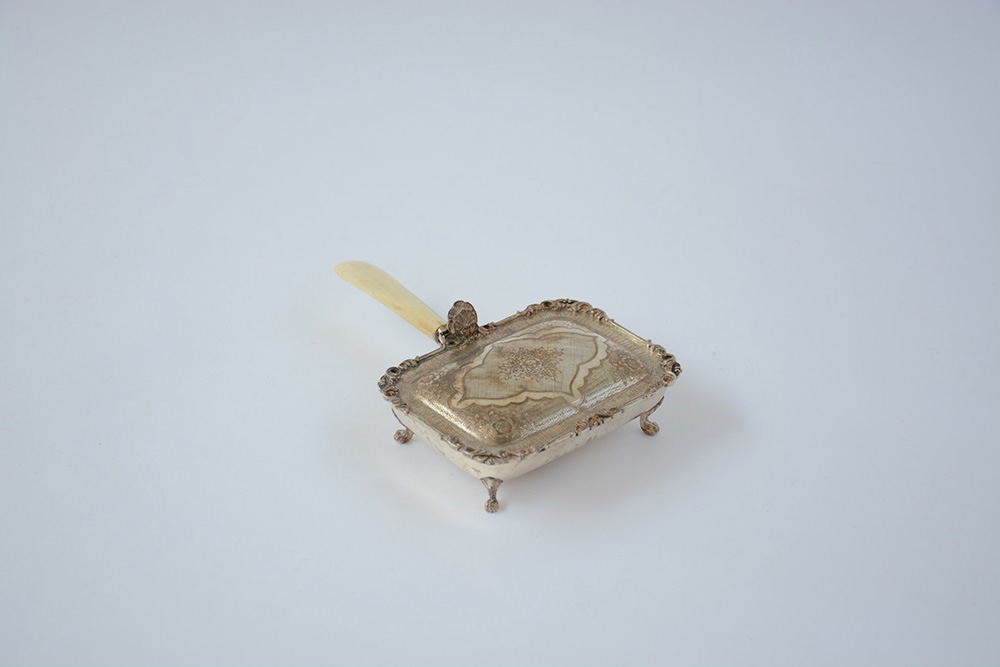 Raccoglibriciole in argento con manico in osso, inciso e decorato in rilievo, piedi ferini (gr. lordi 250 ca) (difetti)