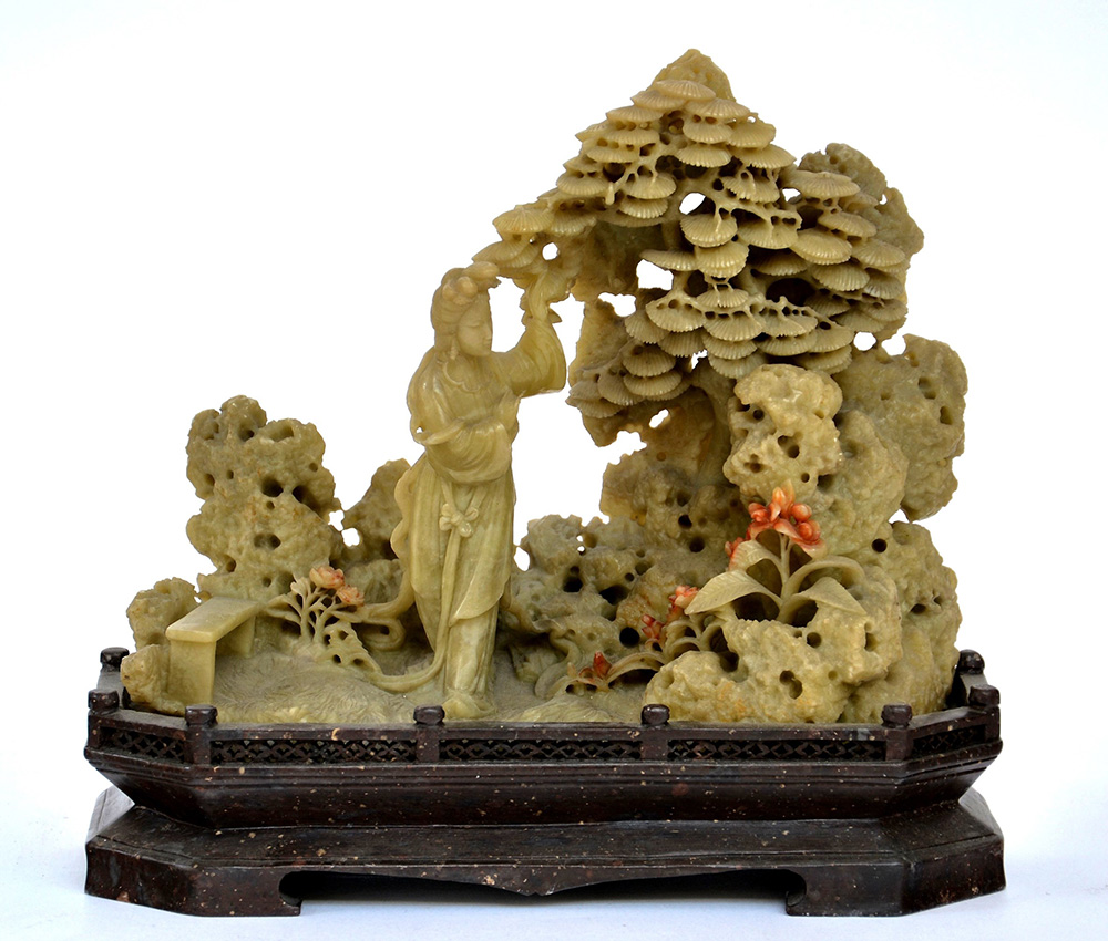 Lotto 115 | Gruppo in pietra saponaria scolpita raffigurante fanciulla entro giardino (h...