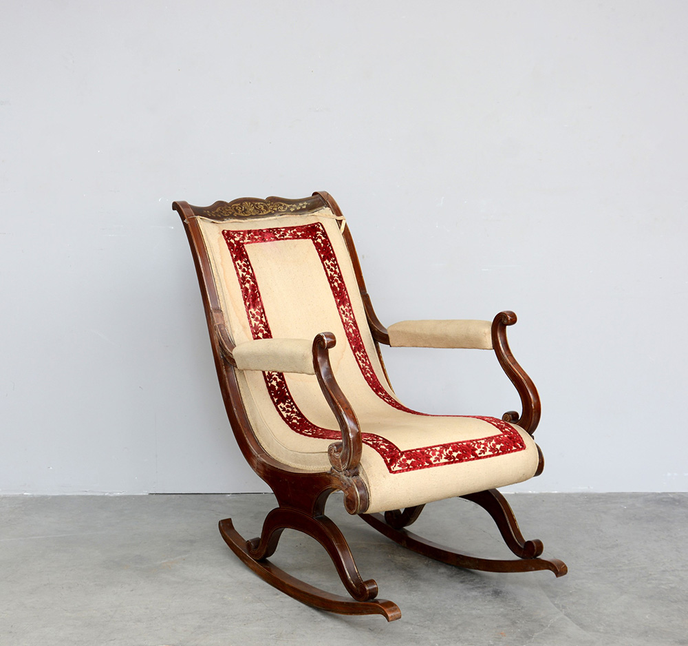 Poltrona a dondolo in mogano, filettata e intarsiata in ottone a motivi...