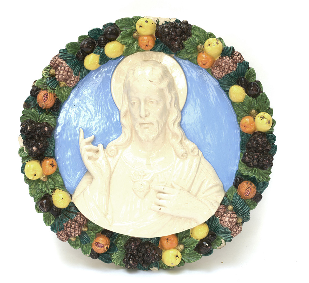 Manifattura italiana. Tondo in cermaica policroma decorato al centro da Cristo benedicente e sul bordo a frutta e foglie (d cm 48)(difetti)