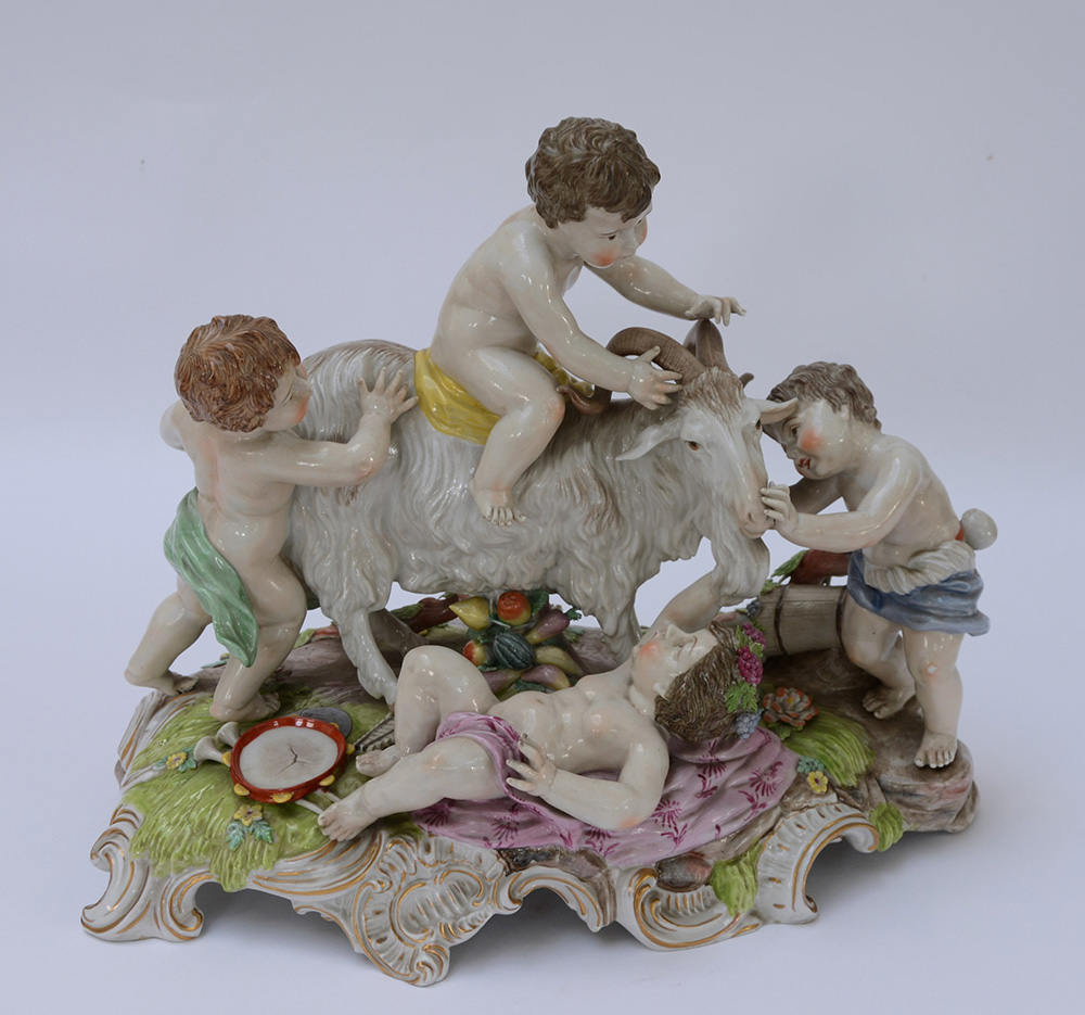Gruppo in porcellana policroma raffigurante putti con caprone (cm 35x40) (difetti)