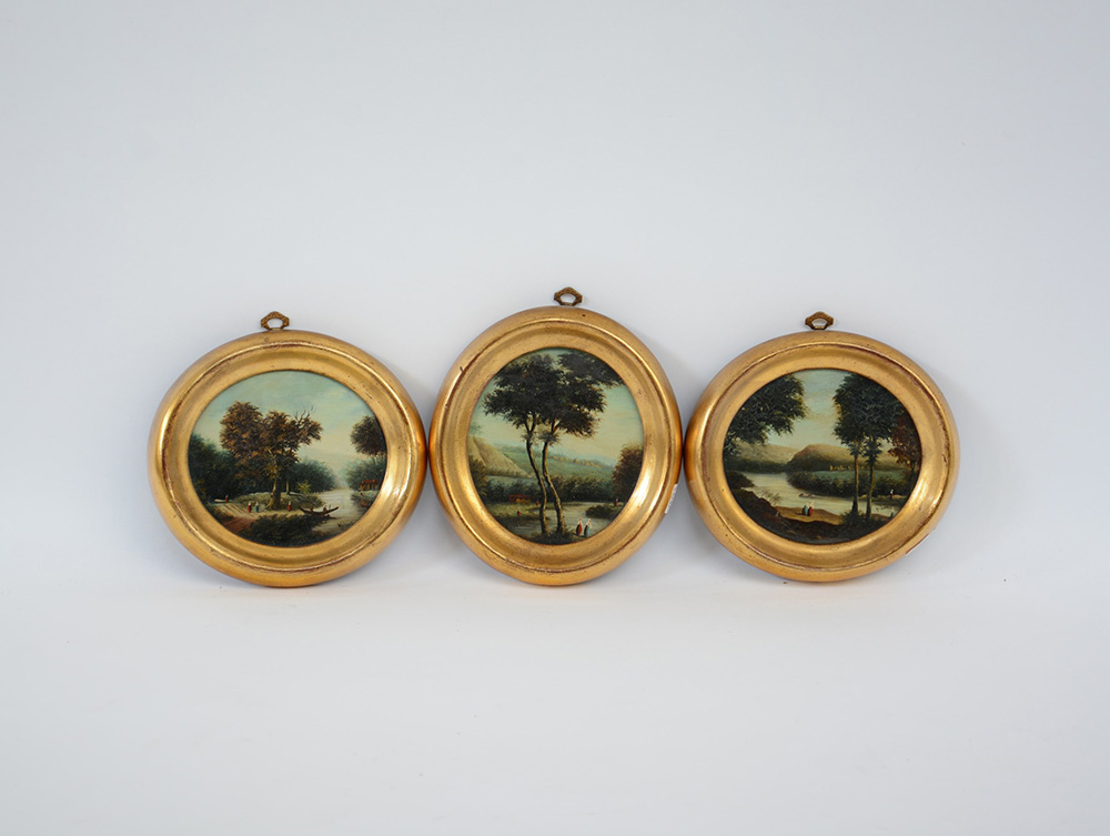 Ignoto, "Paesaggi" gruppo di tre piccoli dipinti ovali su rame (?) (cm 9x10) in cornice dorate (difetti)