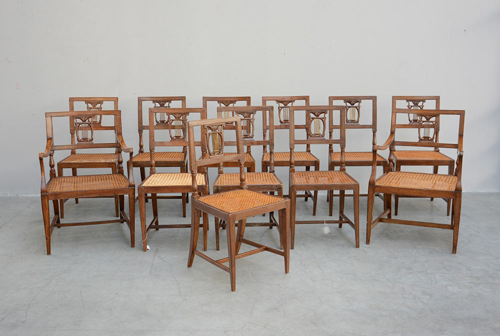 Dieci sedie e due poltrone in noce con seduta impagliata sostegni, posteriori a balaustro (restauri e sostituzioni)