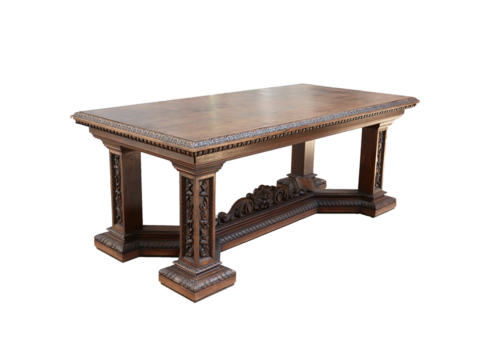 Tavolo rettangolare in stile rinascimentale con fascia scolpita a palmette, gambe a pilastro intagliate a motivi vegetali, traversa dritta decorata al centro da fregio (cm 200x80x100)(difetti)