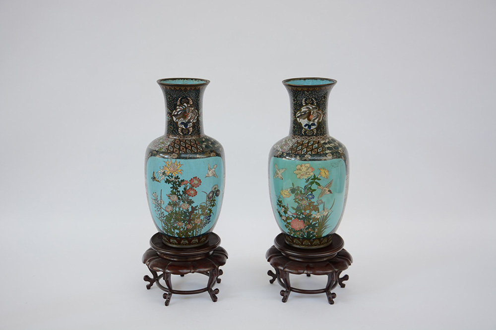 Coppia di vasi in metallo cloisonné decorati a fiori volute ed uccelli, con basi in legno (difetti) Giappone, sec. XX (h. 30 cm.)