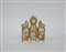 Curioso orologio da tavolo con cassa a forma di paravento in metallo dorato...