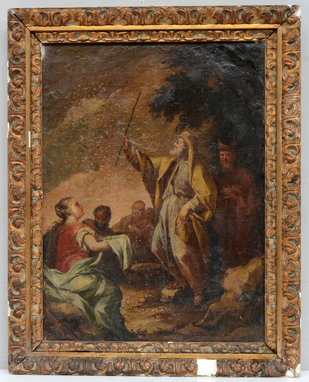 Scuola veneta del sec. XVIII "La raccolta della manna" olio su tela (cm 53x39) in cornice (difetti e restauri)