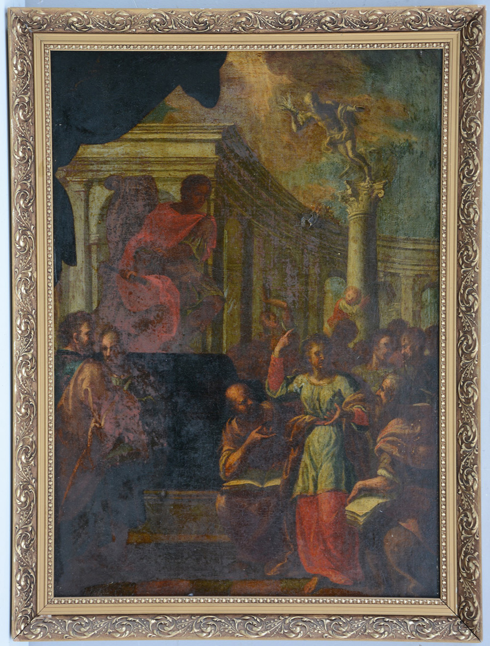 Scuola veneta secolo XVII "Disputa di Santa Caterina" olio su tela (cm 74x51) In cornice (difetti, mancanze e restauri)