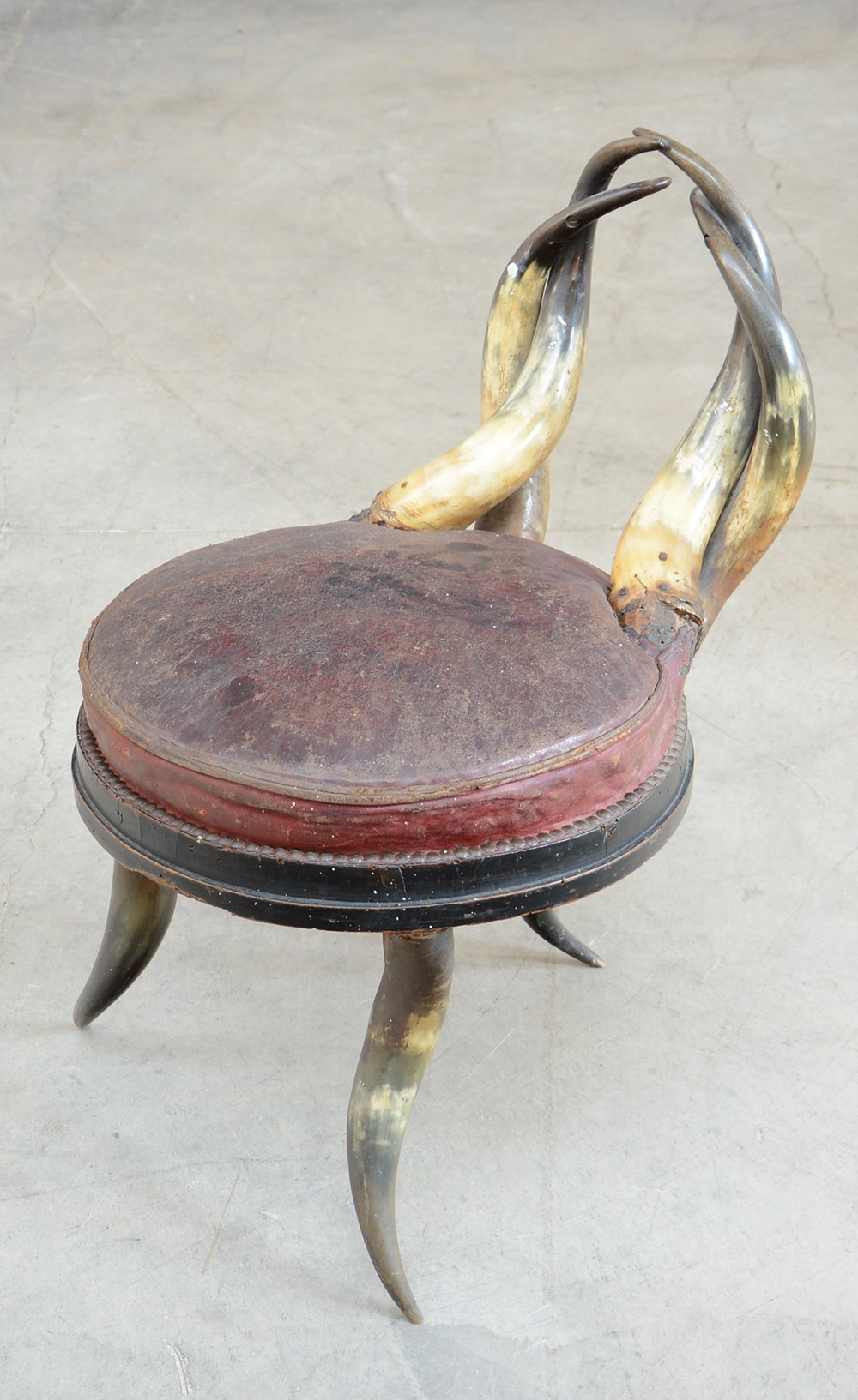 Sgabellino di forma tonda in legno ebanizzato con schienale e gambe composte da corna con seduta in pelle. Sec.XIX (difetti e mancanze)