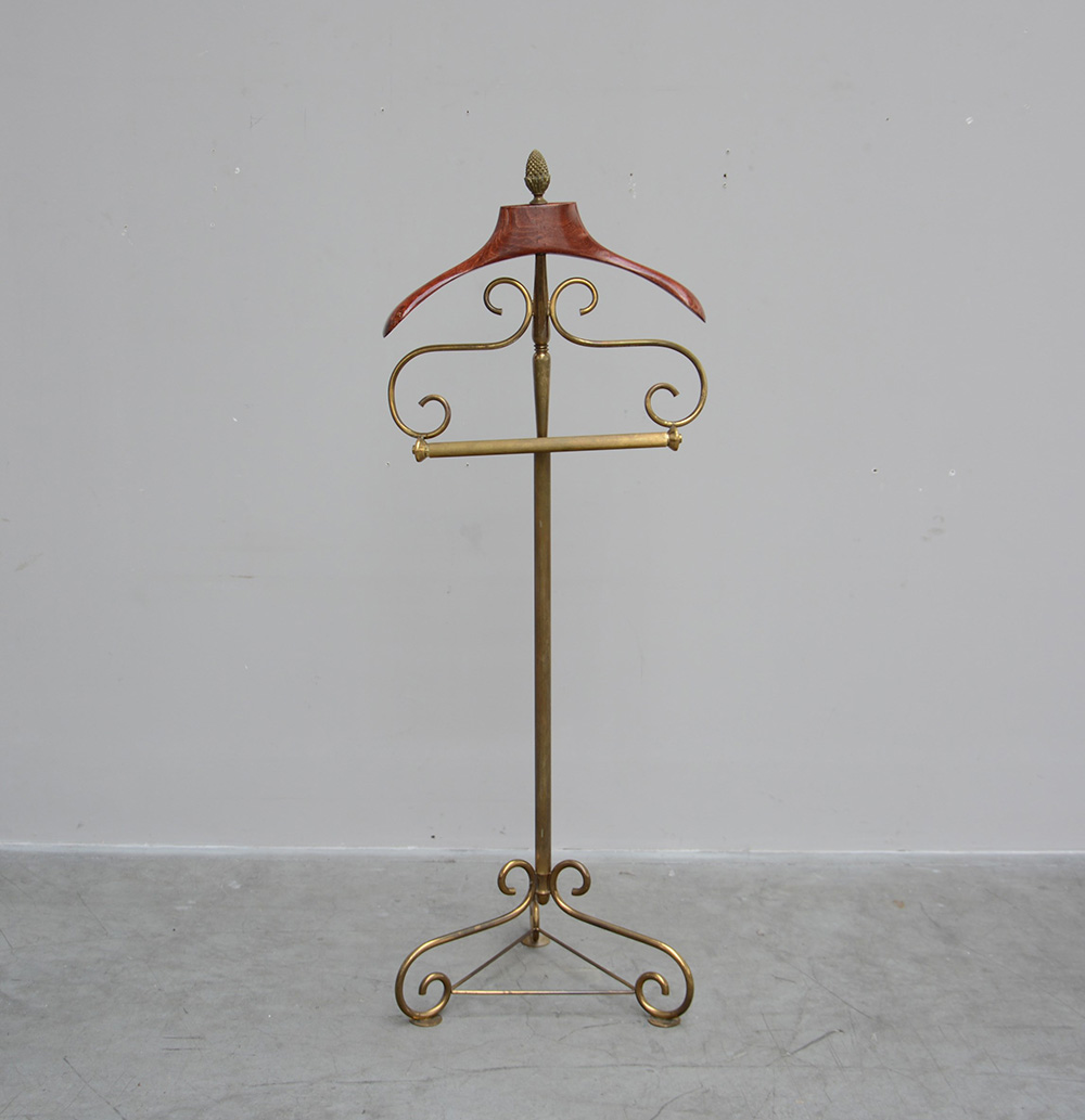 Servomuto da camera tripode in ottone dorato con gruccia in legno sormontato da una pigna (h cm 126) (difetti)