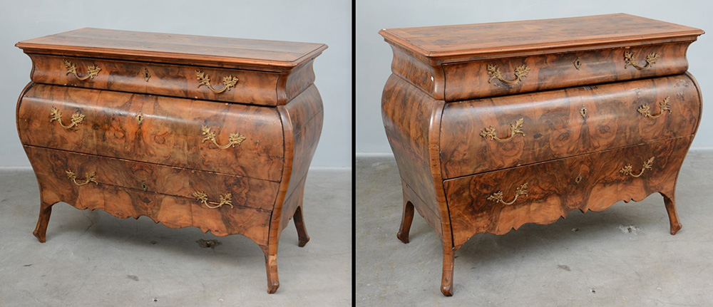 Coppia di comò di forma mossa lastronati in radica di noce, ad un cassetto sottopiano e due grandi sul fronte, fascia e gambe sagomate (cm 120x94x58)(difetti)