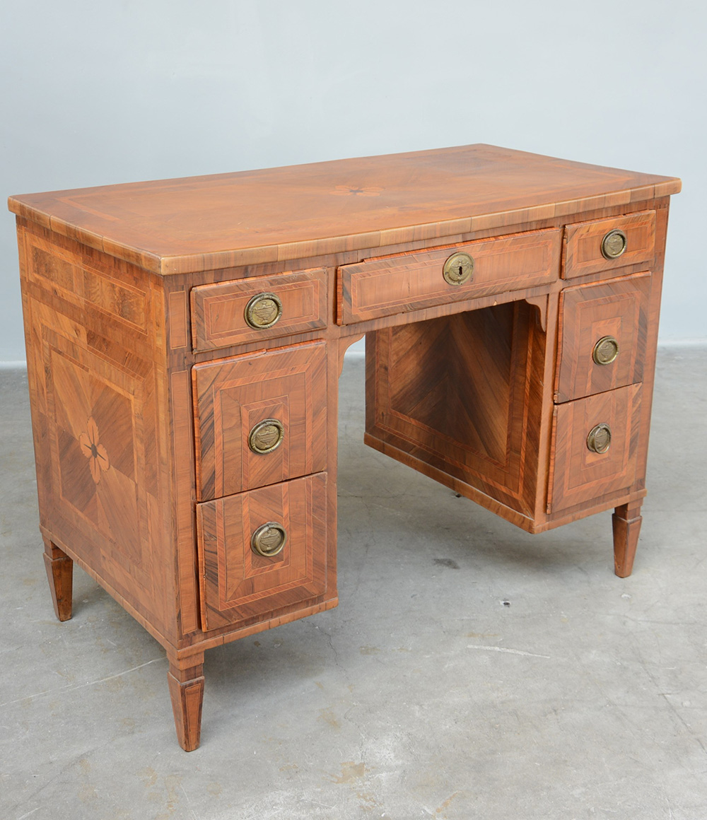 Scrivania da centro lastronata in noce e filettata in legno chiaro, intarsiata sul piano e sui fianchi a motivi floreali, a tre cassettini in linea sottopiano e quattro grandi sul fronte, piedi rastremati (cm 113x87x60)(difetti)