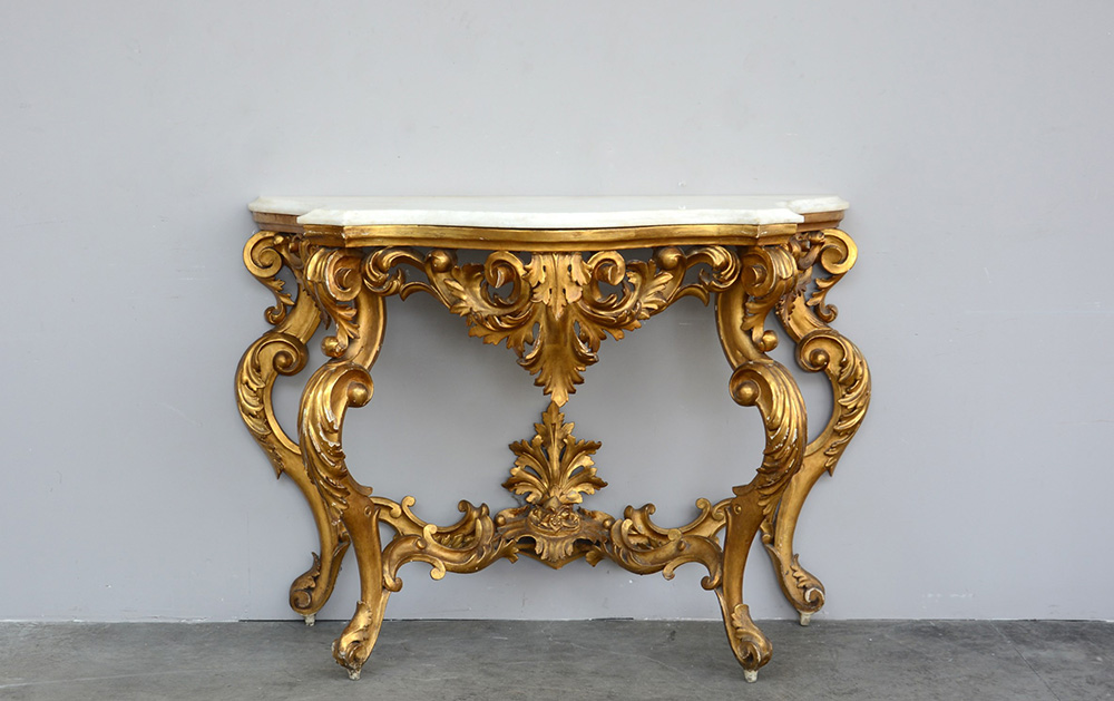 Consolle di forma sagomata in legno dorato. Riccamente intagliata e traforata a motivi vegetali a volute. Gambe sagomate riunite da traverse, terminanti con foglie e frutti. Piano in marmo, sec. XIX (cm 192x104x62)
