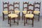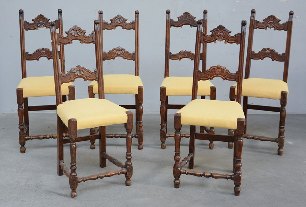 Gruppo di sei sedie con schienale a giorno e cartelle sagoate e intagliate. Gambe e traverse tornite (difetti)