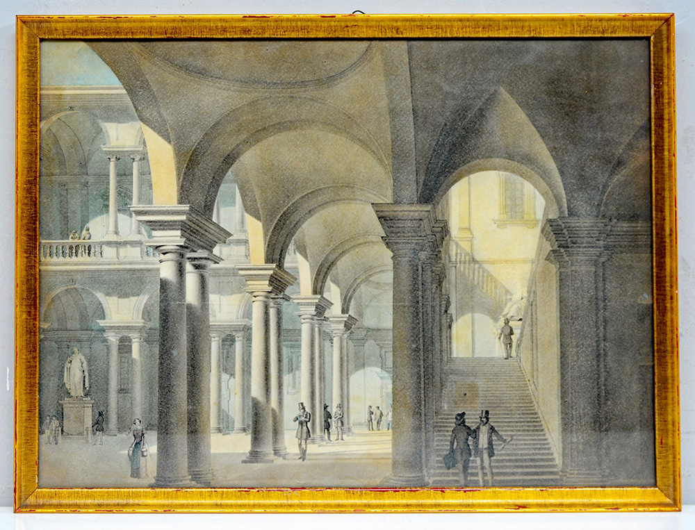 Litografia acquarellata del sec. XIX raffigurante interno di palazzo (cm 36x51) in cornice