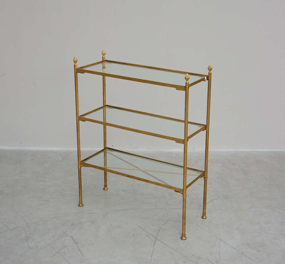 Etagère a tre ripiani con struttura in ottone, montanti culminanti a pigna, ripiani in vetro (cm 63x80x26) (difetti)