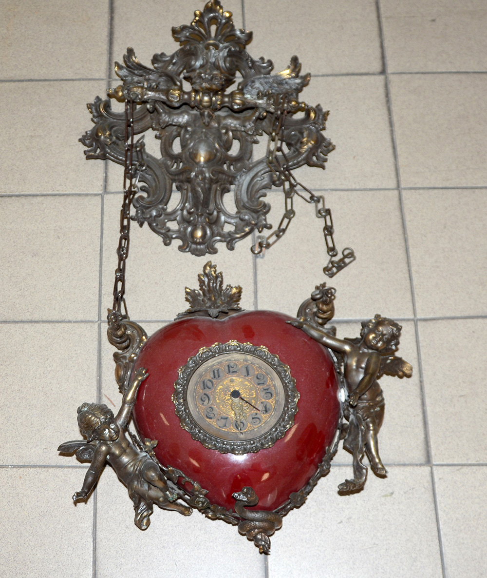 Orologio da parete in bronzo e ceramica a guisa di cuore con figure di putti...