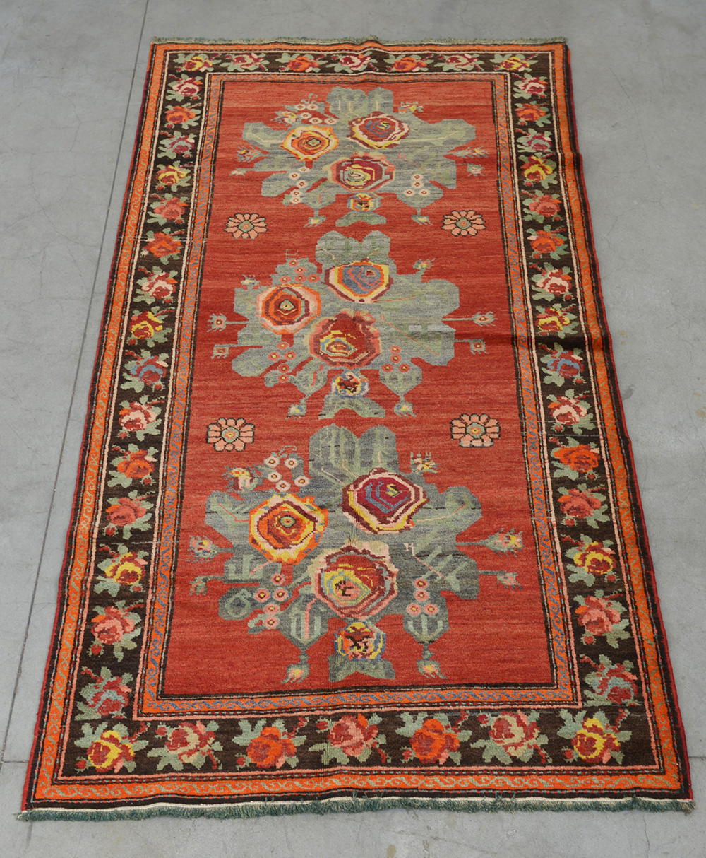 [Tappeti] Tappeto Karabagh, Caucaso, sec. XX. Disegno a motivi floreali di ispirazione francese nei toni del bordeaux, giallo, arancio e marrone su fondo azzurro polvere, campo color rosso. Bordura con rose su fondo marrone scuro (cm 250x128)(difetti)