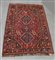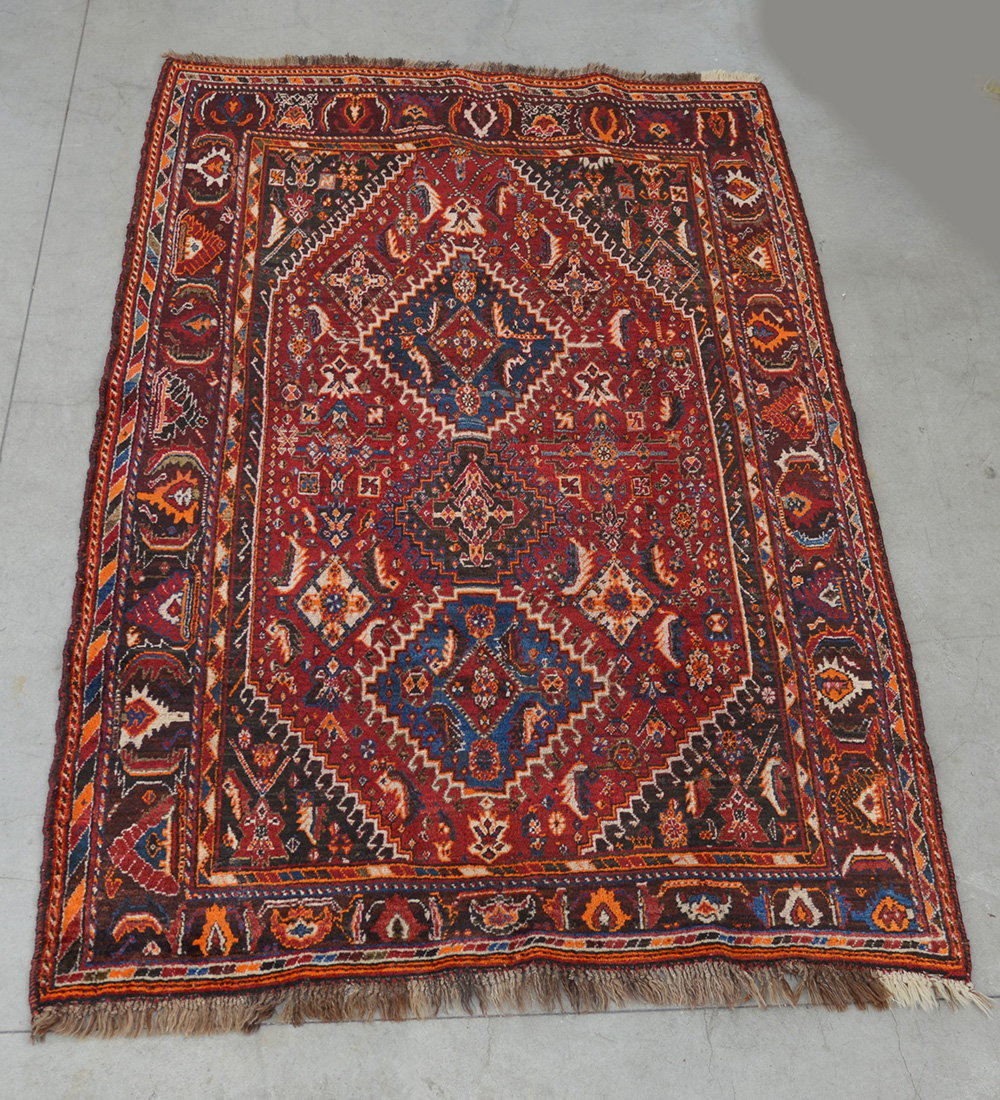 [Tappeti] Tappeto Shiraz, Persia, sec. XX. Disegno a tre medaglioni nei toni del l'azzurro, rosso, bianco e marrone su campo rosso (cm 234x148)(difetti e restauri)
