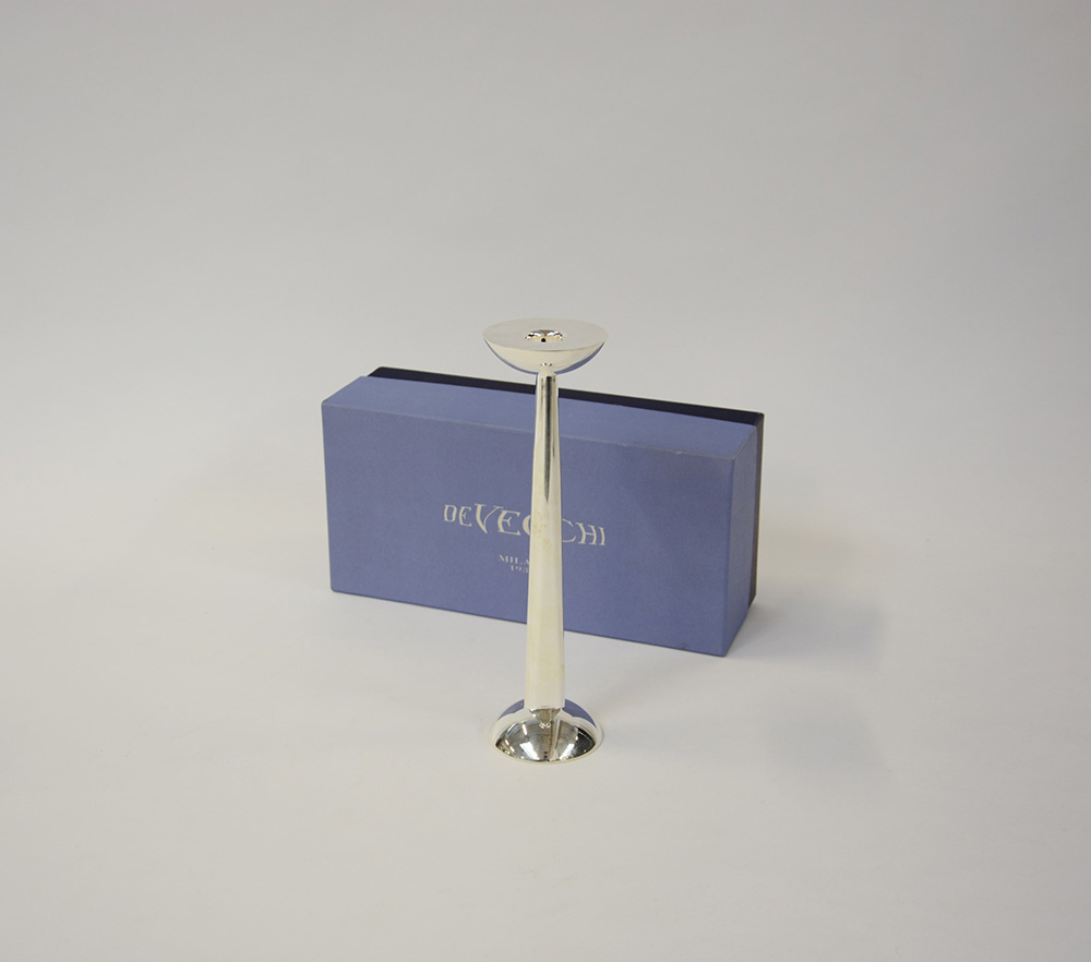 Candeliere in argento con fusto tubolare, basamento e bobeche circolari, marchio dell'argentiere De Vecchi, Milano (gr 280) (h cm 26)