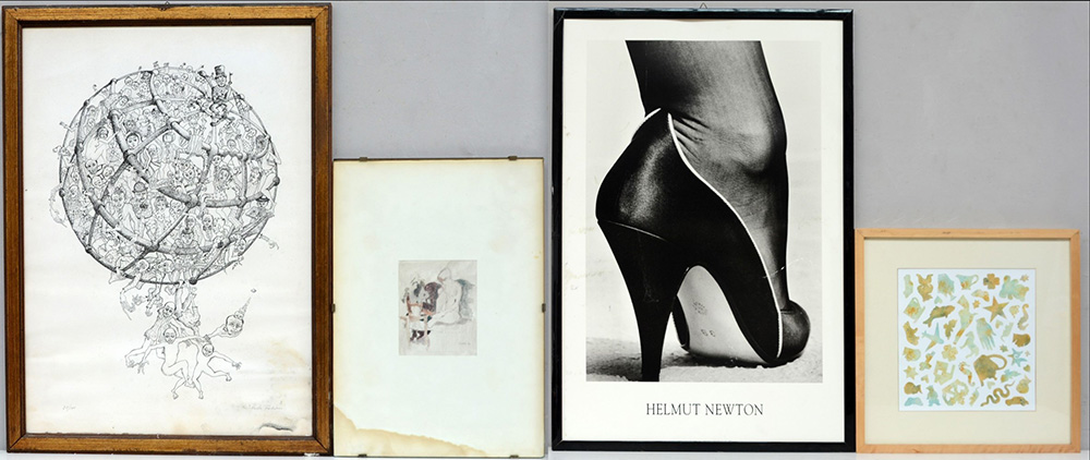 Lotto composto da una litografia di Paola Falini, un manifesto di Helmut Newton, e due composizioni di artisti differenti, in cornici (difetti)
